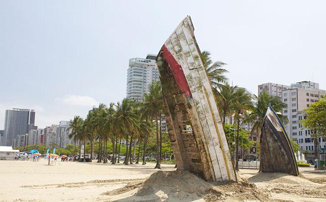 Na Praia do Gonzaga, em frente a Praça das Bandeiras, ele apresenta uma instalação que consiste em duas embarcações de sete metros. Semi enterradas nas areias na posição vertical, ambas refletem sobre o resíduo das intervenções urbanas e naturais. Assim, a obra contrapõe poeticamente barcos tradicionais de madeira que relutam em existir à expansão portuária e à escala das grandes embarcações que adentram o Porto de Santos. O projeto reflete o processo de urbanização, a diminuição do espaço da areia da praia e a disputa entre cidade e mar.
