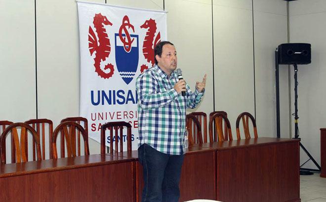 SANTOS – O jornalista da rádio Bandeirantes Alexandre Praetzel esteve na Universidade Santa Cecília (Unisanta), na noite de sexta-feira (29), para falar com os alunos sobre sua experiência no mundo esportivo, onde atua há 22 anos. Formando em 1992, o repórter também realiza palestras e cursos de jornalismo esportivo.