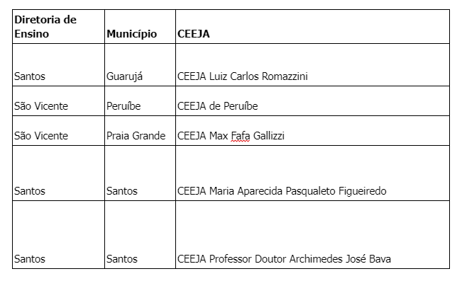 Atualmente, há 39 CEEJAs no estado. Na Baixada Santista, são cinco unidades. Confira a lista abaixo: