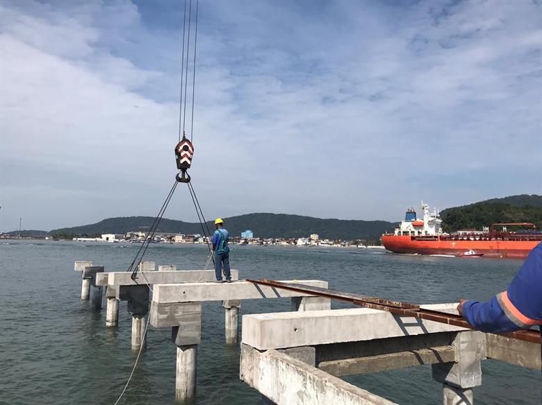 SANTOS – Com o auxílio de um guindaste, terminou, na manhã desta terça-feira, a instalação de todas as vigas do Deck do Pescador. Um conjunto de 13 peças de concreto foi colocado sobre as estacas e bases fincadas no mar. A obra, que visa recuperar o tamanho original da estrutura localizada na Av. Almirante Saldanha da Gama, na Ponta da Praia, deve ser entregue em agosto.