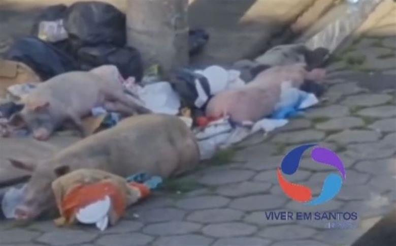 Porcos são flagrados revirando lixo em rua de São Vicente