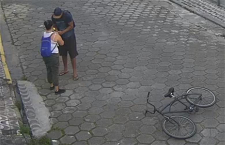 As câmeras de monitoramento flagraram um homem de bicicleta se aproximando, tirando uma faca e subtraindo pertences.