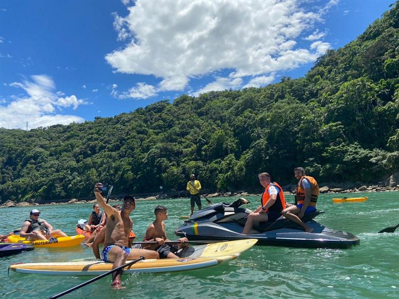 Bolsonaro tira foto com equipe de caiaque a caminho da Fortaleza de Itaipu