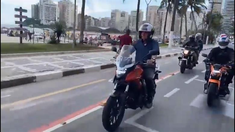 Bolsonaro circula por Guarujá de moto e tira selfie com apoiadores