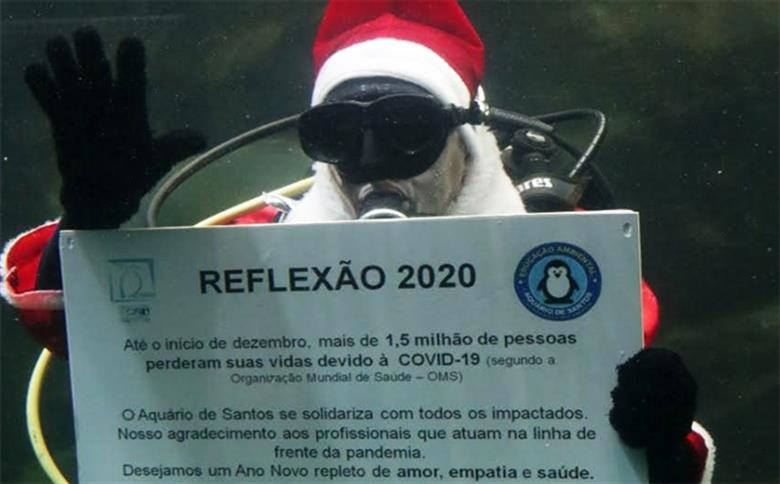 Papai Noel mergulha no Aquário de Santos com mensagens de conscientização contra Covid-19