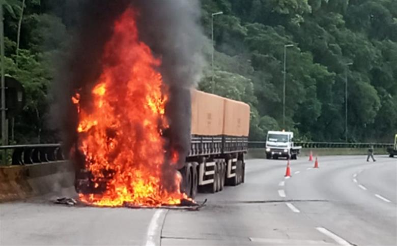 Caminhão pega fogo e causa interdição da pista de subida da Imigrantes; veja o vídeo