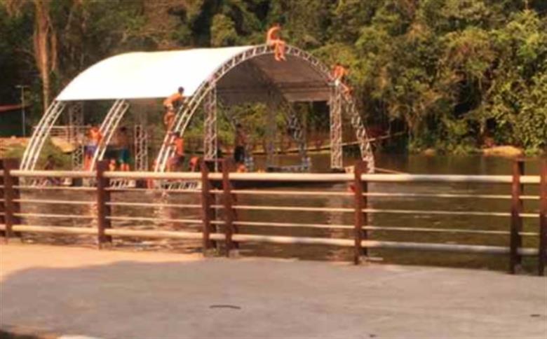 Em dia de muito calor, jovens aproveitam para mergulhar na Lagoa da Saudade, em Santos