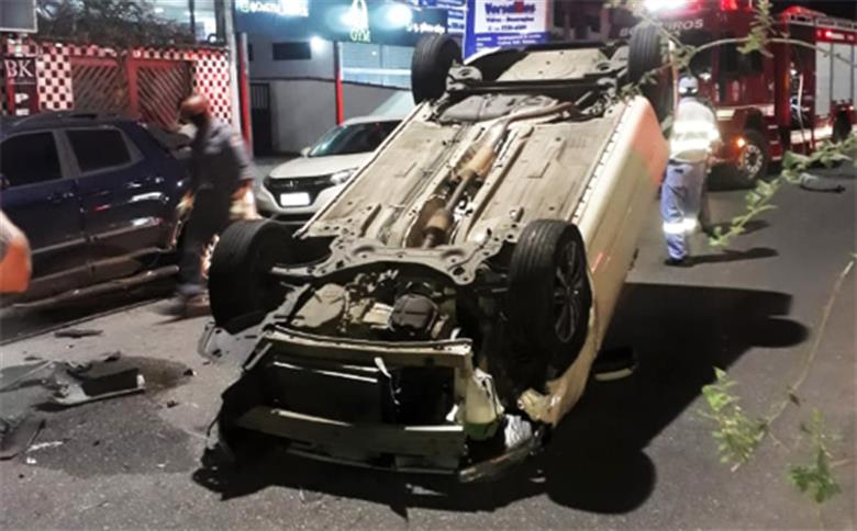 Motorista bate em veículos estacionados e carro capota em avenida de Santos; Vídeo
