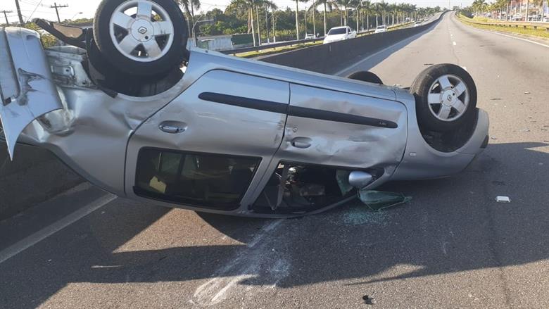 Carro capota após batida de caminhão na traseira em Praia Grande