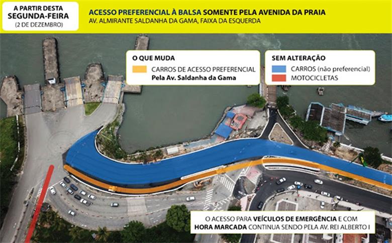 A partir desta segunda-feira (2) o motorista com acesso preferencial à travessia de balsas Santos-Guarujá deverá chegar ao bolsão de embarque pela Avenida Almirante Saldanha da Gama (da orla), na faixa da esquerda não mais pela Avenida Rei Alberto I.