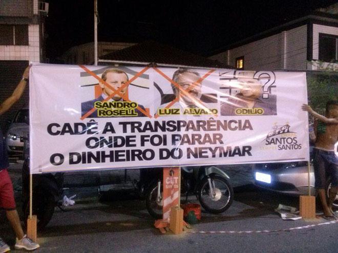 A polêmica da venda de Neymar para o Barcelona parece estar longe de ter fim e na noite desta quarta-feira (29), de clássico paulista, não é diferente. Antes da partida, entre Santos FC e Corinthians que começa daqui a pouquinho, às 22h, torcedores do Peixe protestam na Vila Belmiro com faixas e cartazes revoltados com a diretoria do Clube.