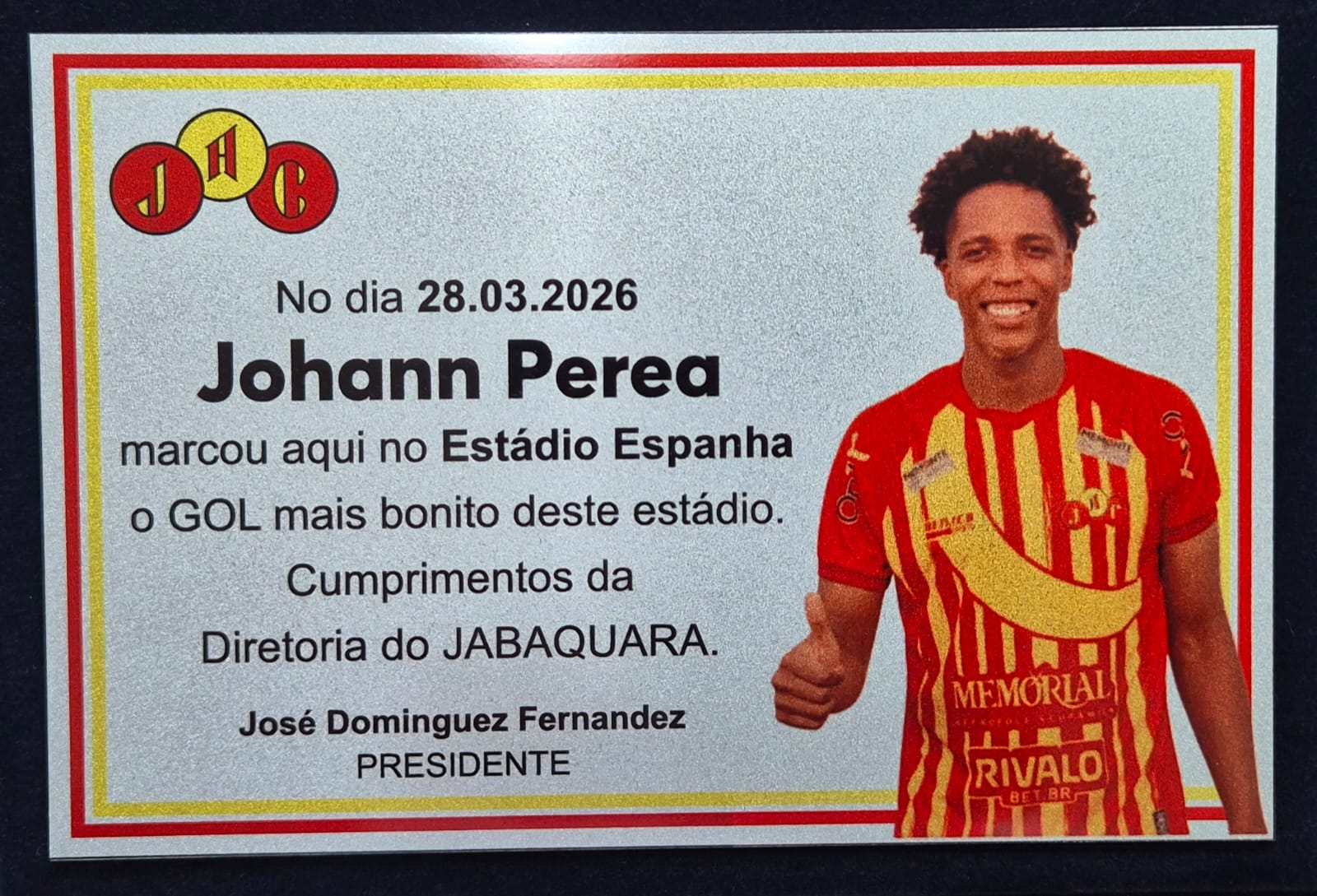 Imagem da placa recebida pelo zagueiro equatoriano (divulgação Tática Assessoria)
