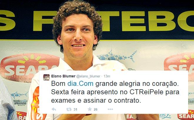 “Bom. Com grande alegria no coração. Sexta feira apresento no CT Rei Pele para exames e assinar o contrato”, publicou Elano em sua conta oficial no Twitter (twitter.com/elano_blumer)