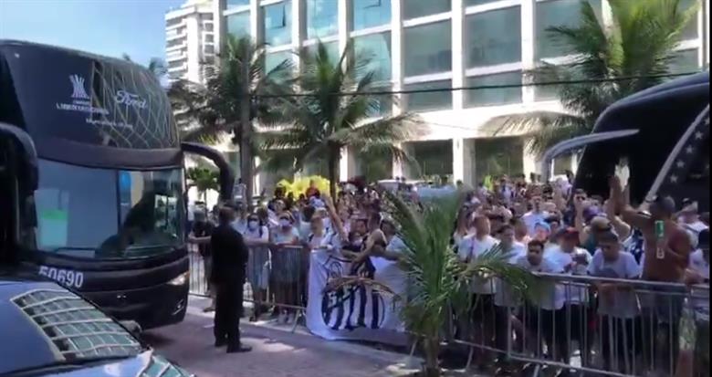 Torcedores recebem ônibus do Santos em chegada ao Maracanã
