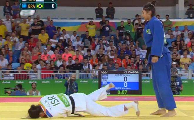 A judoca brasileira Mariana Silva dá uma entrada de golpe em Szandra Szogedi (Gana), que consegue se defender, mas a brasileira encaixa estrangulamento e avança de fase.