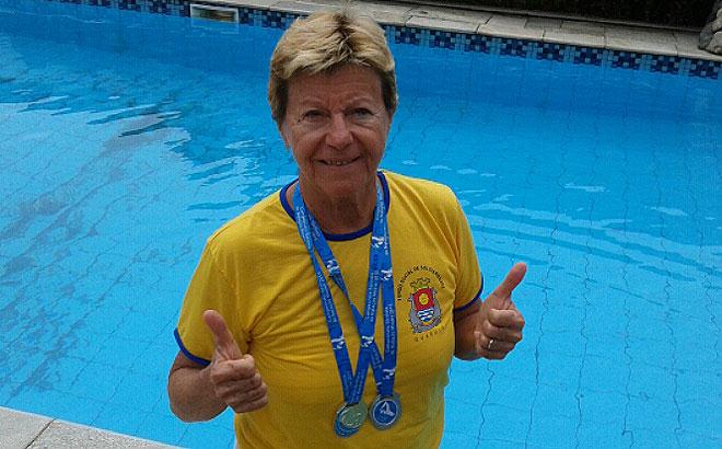 Com 68 anos, Campeã do Circuito Paulista de Natação e do Troféu Adalberto Mariani, em Santos, a atleta Elvira Rita Valente de Almeida conquistou recentemente duas medalhas de ouro e uma de prata na categoria maiores de 65 anos.