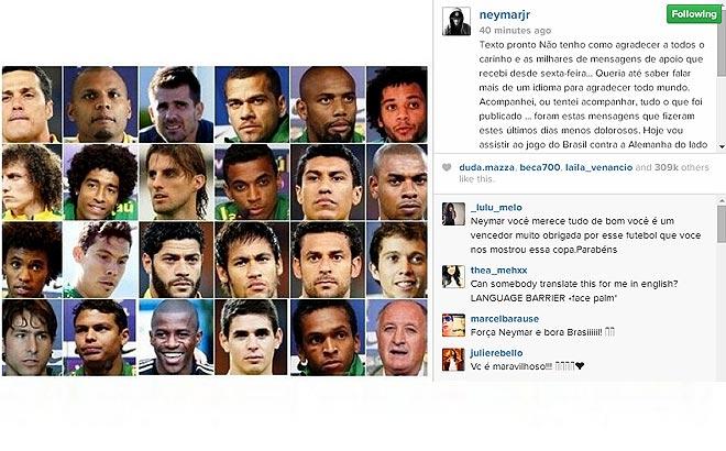 A menos de dez horas para o jogo do Brasil contra Alemanha, pela semi- final da Copa do Mundo Fifa Brasil 2014, Neymar, que sofreu uma lesão nas costas no último jogo e está fora do Campeonato deixou uma mensagem em uma de suas redes sociais, na manhã dessa terça-feira (8).