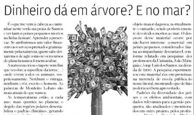 O título do artigo, “Dinheiro dá em árvore? E no mar?” é uma referência ao título do livro do ambientalista inglês Tony Juniper, que, advertiu: O que a Natureza Fez por Nós – Dinheiro Dá Sim em Árvores). “Se atribuirmos um valor financeiro aos serviços prestados gratuitamente pela natureza, quem sabe deixaremos de agir como se os recursos do planeta nunca fossem acabar”, diz um trecho do artigo. “As temperaturas estão, a cada ano, cada vez mais quentes no planeta; a diminuição do mar congelado do Ártico desestabilizou um padrão climático e correntes de jato criam zonas de frio e calor extremos no mundo”, afirma a educadora e pesquisadora.