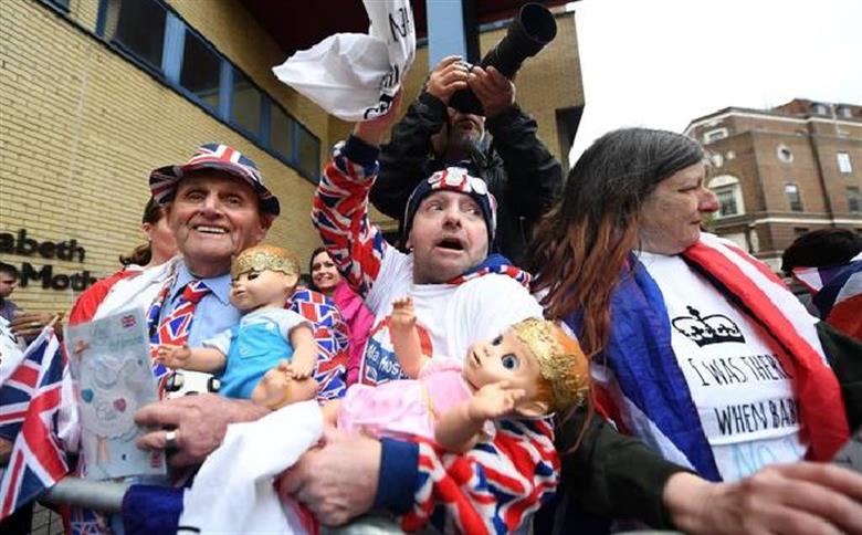 Na frente do hospital Saint Mary, diversas pessoas estão reunidas com cartazes para celebrar a chegada do novo bebê real.