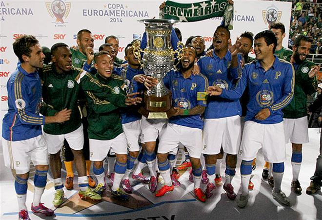 PALMEIRAS – Sem vencer há seis rodadas no Campeonato Brasileiro 2014, o Palmeiras-SP alegrou seus torcedores na quarta-feira (30) com a vitória por 2 a 1 contra o Fiorentina-ITA, triunfo este que rendeu o troféu Julinho Botelho na Copa EuroAmericana 2014, rendendo um ponto aos times das Américas contra os da Europa. A partida aconteceu no Estádio Paulo Carvalho de Machado (Pacaembu) com o apoio dos mais de 20 mil alviverdes, que viram os gols de Victor Luis e Leandro para o Verdão, e Rossi descontando para os italianos.A noite marcou também a estreia do novo uniforme azul e dos jogadores Agustin Allione, Léo Cunha e Victorino, apresentados pelo Alviverde nos últimos dias.