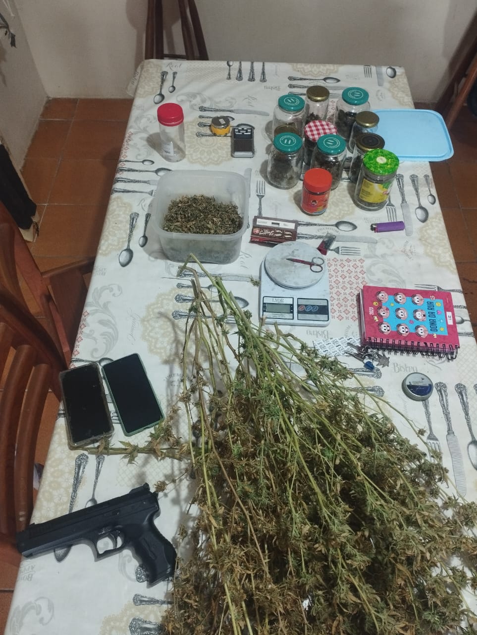 Foram apreendidos 25 vasos com a substância ilícita e diversos objetos como potes de vidros, um de plástico com a maconha já colhida, duas balanças e um simulacro de arma de fogo.
