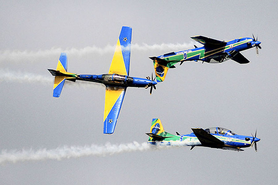 Toda apresentação da Esquadrilha da Fumaça conta com sete pilotos em sete aeronaves A-29 Super Tucano da Embraer, modelo caça responsável pela garantia da segurança nas fronteiras do país atualmente, que seguem os últimos avanços em sistemas aviônicos.