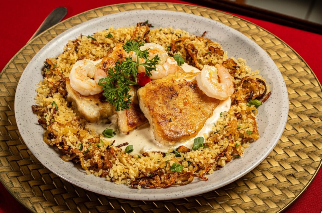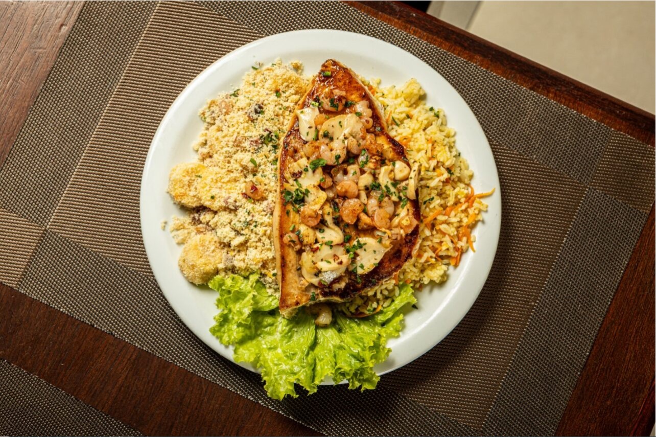 - Meca à Moda (Meca grelhada com molho de camarão 7 barbas e champignon, arroz branco com cenoura ralada, palmito e açafrão e farofa de banana – R$ 55,00).