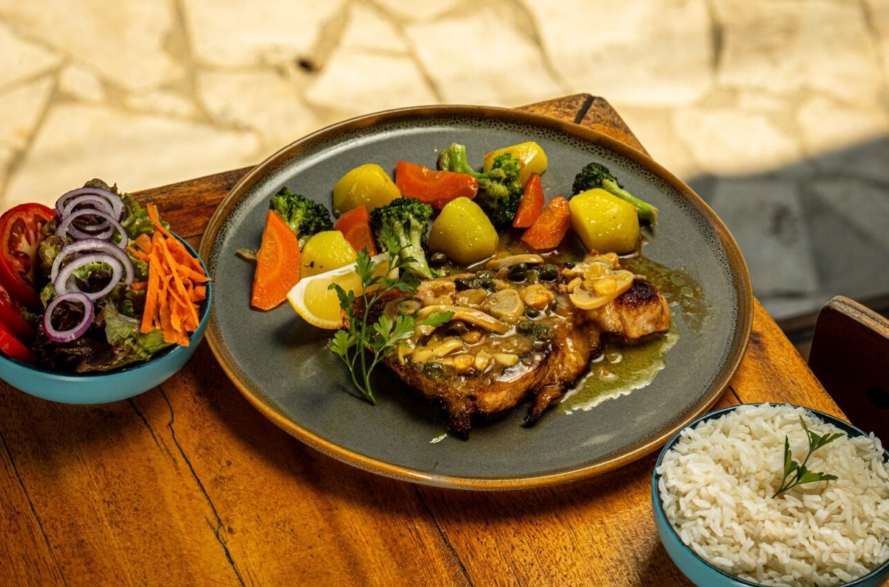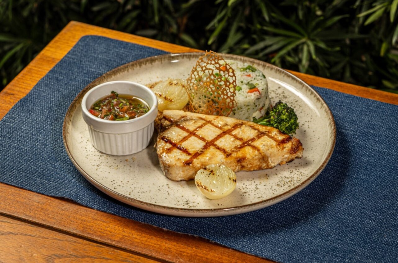 - Meca à Guiné (Lombo de meca grelhada, hambúrguer de pirão com shimeji salteado na manteiga, arroz de coco com molho de manga – R$ 68,90).