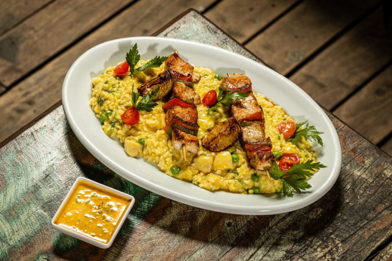 - Meca Imperial (Brochette de meca grelhada com risoto milanês de champignon e ervilhas frescas ao caldo de camarão. Acompanha molho de moqueca – R$ 69,99).