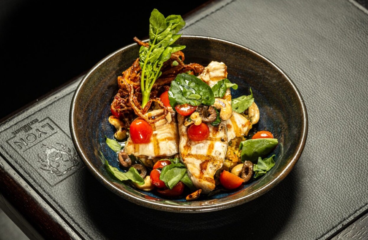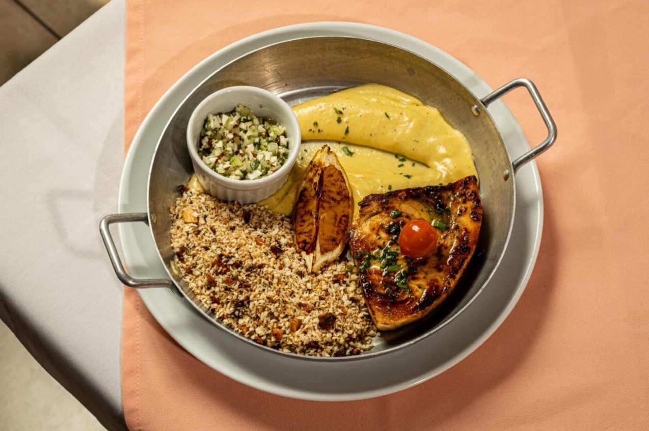 - Meca grelhado da Terra (Meca grelhada com arroz à grega, farofa crocante e vinagrete de ervas, decorado com echalote e brócolis tostados – R$ 69,00)