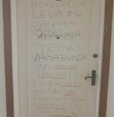 Conforme a denúncia, os crimes foram cometidos no dia 5 de maio de 2021, no edifício da Avenida General Francisco Glicério, 637, no José Menino. O zelador, de 51 anos, e uma moradora, que é economista e tem 48 anos, foram ofendidos pela nutricionista. Na porta do apartamento dessa vizinha e em áreas comuns do prédio, a ré escreveu as frases “negra, vagabunda, dos crimes, porcas” e “negro quando não faz na entrada faz na saída”.