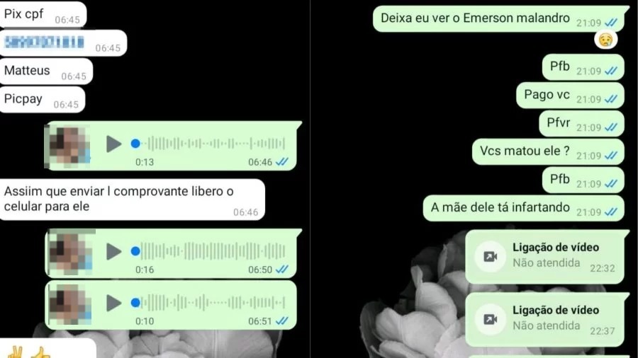 Na quarta-feira (16), recebeu um áudio de um número desconhecido. A mensagem dizia que ela era “irredutível” e que “o patrão ia resolver”, sugerindo que Emerson poderia ser morto. O mesmo interlocutor alegou que Emerson havia usado drogas – o que a mulher nega. “O cara estava se passando por ele para tentar arrancar dinheiro. Quando viu que eu não ia mandar, ele sumiu. Não atendeu mais, o celular só dá caixa postal, e a foto do WhatsApp desapareceu. Acho que o Emerson foi roubado”.