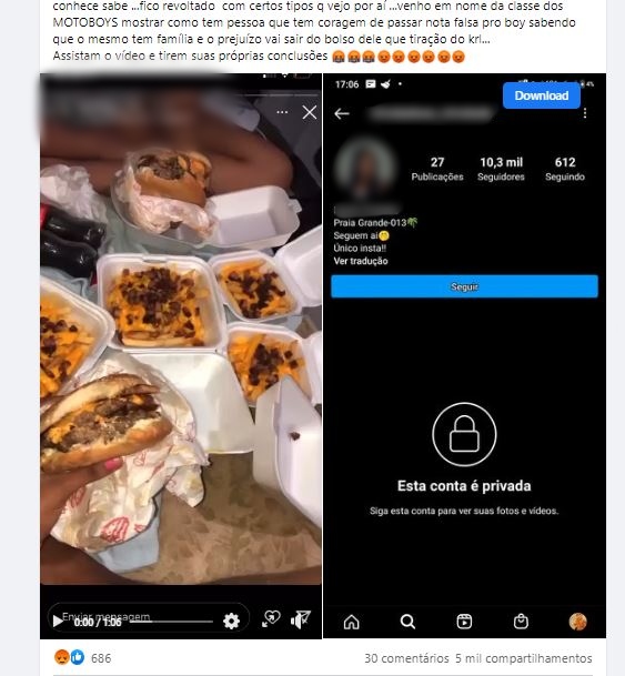 Após a postagem, outro entregador postou o vídeo da jovem para mostrar a sua indignação com a situação. “Fico revoltado com certos tipos que vejo por aí. Venho em nome da classe dos motoboys mostrar como tem pessoa que tem coragem de passar nota falsa sabendo que ele tem família e o prejuízo vai sair do bolso dele”, afirma na publicação, que teve mais de 5 mil compartilhamentos.