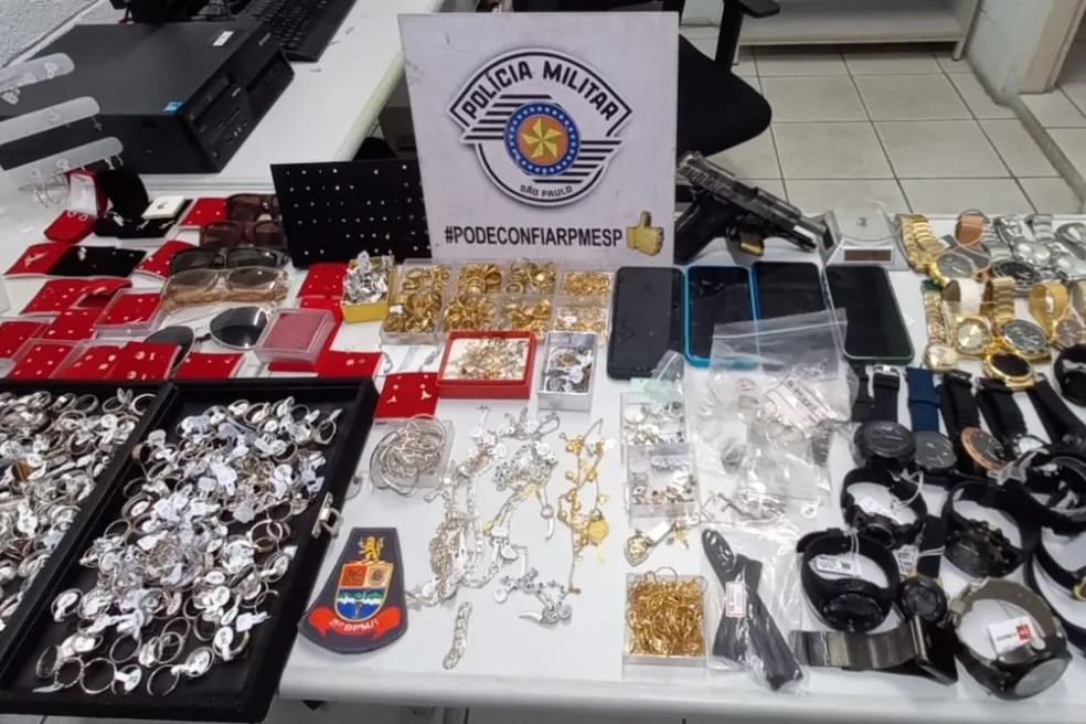 Além do Meriva, do Fiesta e do Onix, os agentes de segurança apreenderam com o bando cinco armas de fogo, sendo quatro pistolas e um revólver. A proprietária da joalheria avaliou preliminarmente em cerca de R$ 50 mil os produtos roubados de sua loja. Os PMs recuperaram no apartamento 44 relógios, 182 alianças, 421 anéis, 27 correntes, 111 pares de brinco, 19 pulseiras, sete pingentes e cinco óculos de sol. (EF)