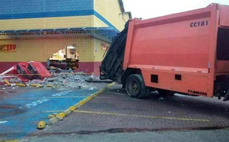 Criminosos usam caminhão de lixo, mas não conseguem furtar caixas eletrônicos de supermercado