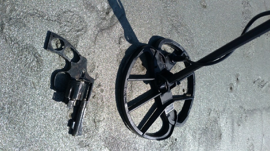 Caçador de metais nas praias santistas nas horas vagas, Eduardo Henrique Gomes encontrou enterrada na areia, uma carcaça de revólver.