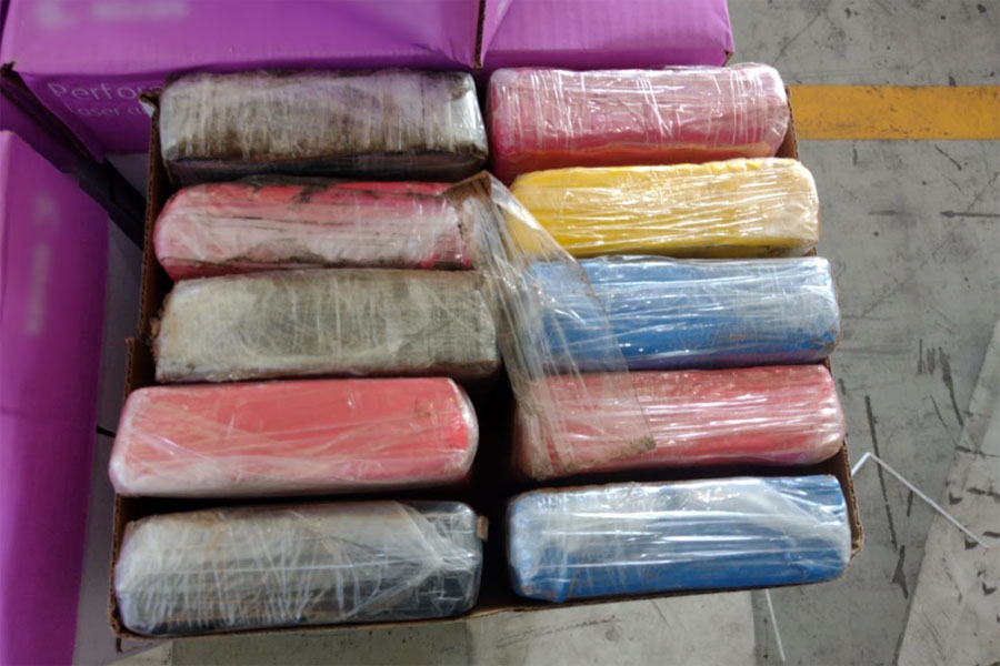 Durante a inspeção, o cão farejador da Receita Federal sinalizou positivamente para a presença de drogas. Aberta a carga, foram localizados diversos tabletes de cocaína em seu interior, que totalizaram 343 kg.