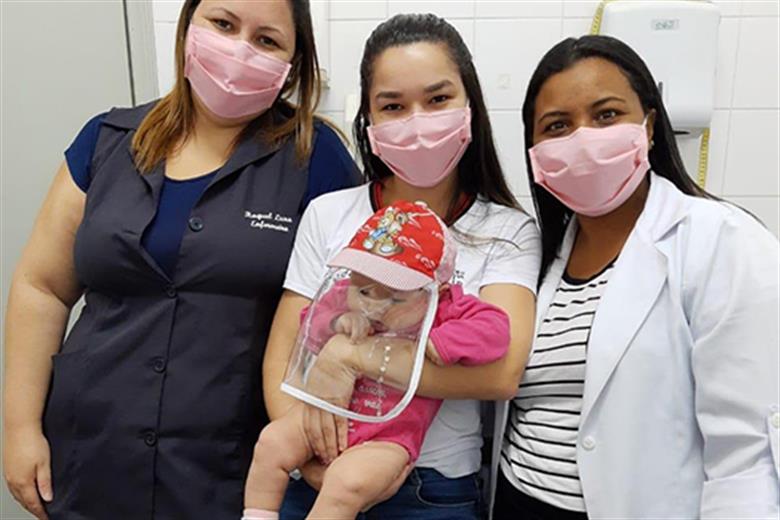 Como as crianças menores de 2 anos não podem usar máscaras, criamos a viseira que protege e pega toda a face do bebê. A gente também teve o cuidado de orientar as mães sobre o uso correto, para não que não houvesse risco de asfixia, comenta a enfermeira Mileide Muniz da Cunha, uma das idealizadoras do projeto.