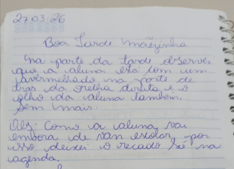 Recado deixado na agenda da menina