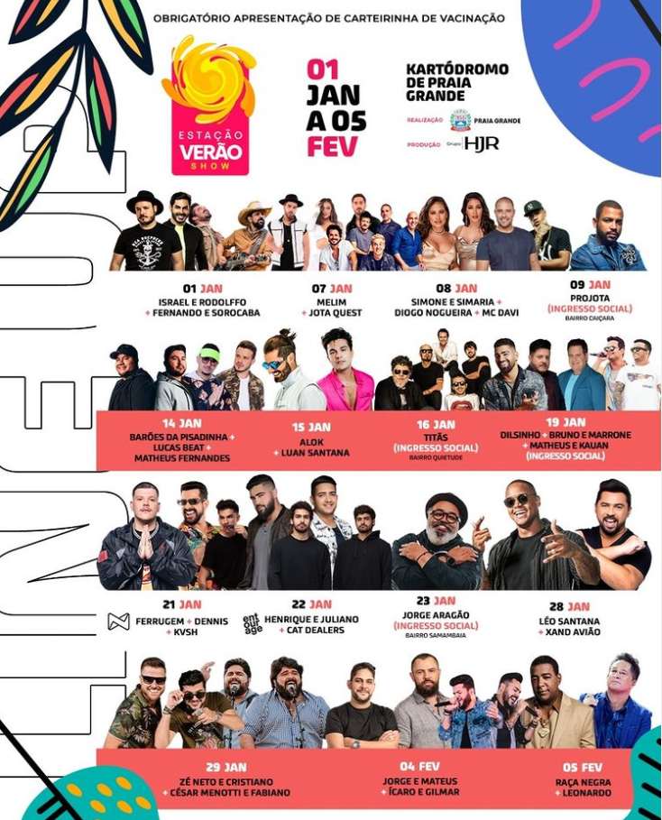 Entretanto, os integrantes do grupo Jota Quest testaram positivo para a covid-19. Sendo assim, o show da banda, que seria nesta sexta-feira (7), foi substituído pelo grupo de pop rock Biquíni Cavadão. Contudo, de acordo com a Prefeitura de Praia Grande, o show da banda Melim, previsto para a mesma data, está mantido.