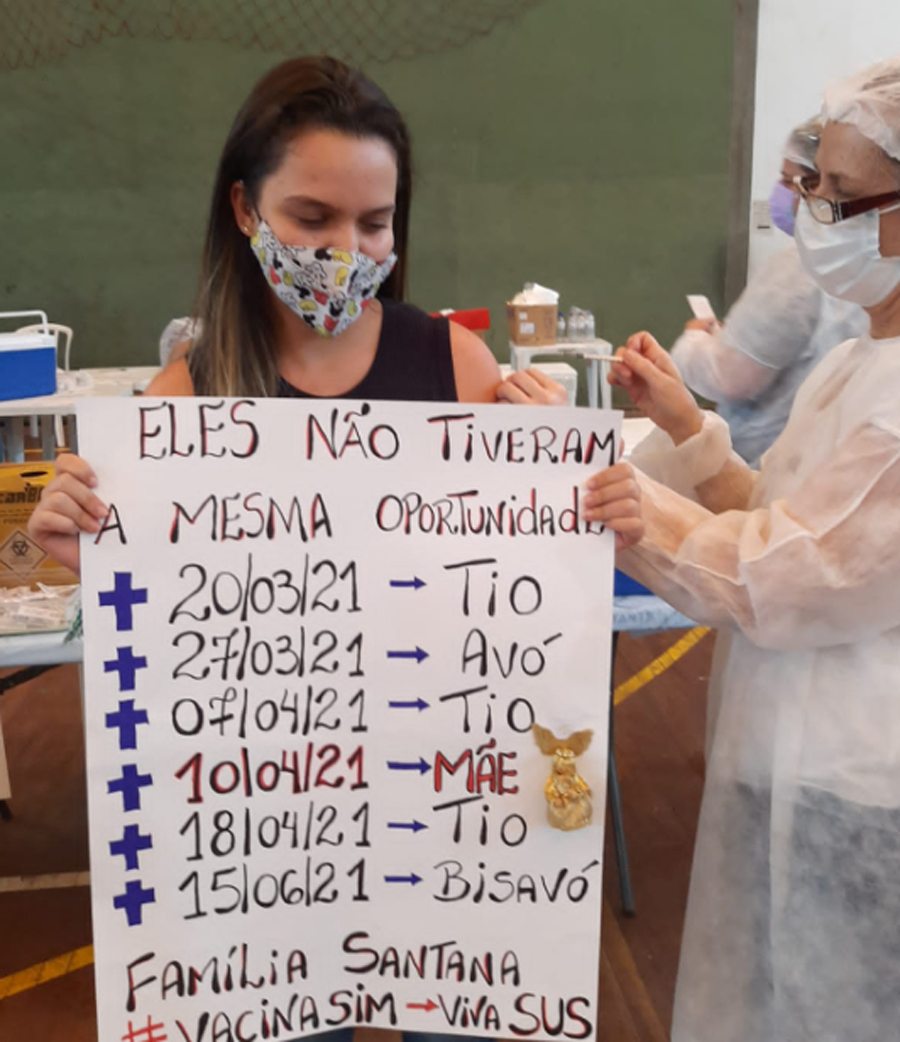 A adolescente Bruna Santana Prates Gomes, de 15 anos, viralizou na internet ao postar uma foto com um cartaz em homenagem para seis parentes seus que morreram por causa da covid-19. Bruna, que mora em Santos, postou a foto tirada enquanto recebia a primeira dose do imunizante contra a doença.