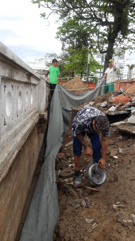 Essa pequena área em frente à Avenida Saldanha da Gama, 163, prosseguiu ele, já foi estucada do lado externo (Estuário) para garantir reforço à estrutura, aterrada e recebeu bidim, manta sintética utilizada para drenar e impermeabilizar, com vida útil estimada em 400 anos.
