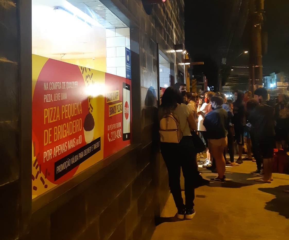 A promoção de uma pizzaria causou aglomeração na Rua Goiás, em Santos. O estabelecimento decidiu vender pizzas a R$ 15 em 10 sabores para quem retirasse no loca