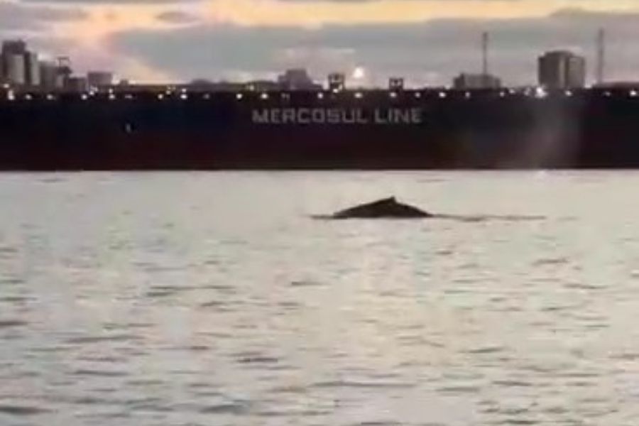 Baleia é vista no Porto de Santos e autoridades são acionadas por risco de encalhe; vídeo