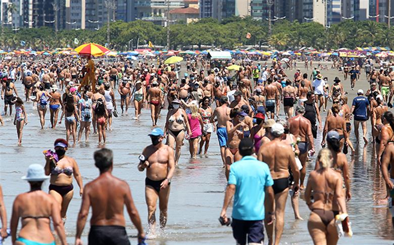 Milhares de banhistas se aglomeram em domingo de carnaval com praias lotadas em Santos