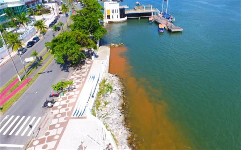 Uma mancha marrom no mar chamou a atenção de quem passava pela Ponta da Praia na tarde desta segunda-feira (7).