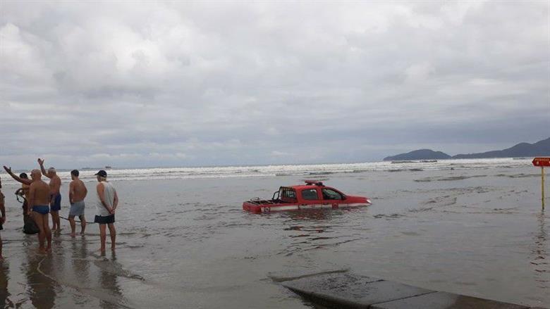 Viatura do Corpo de Bombeiros atola na praia de Santos e vira atração de banhistas