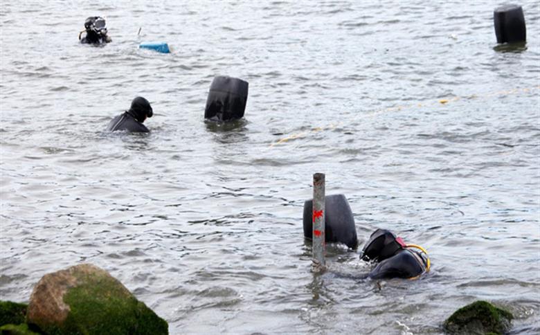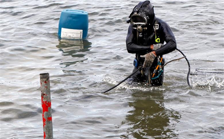 Tapetes são instalados submersos em obra no mar para barrar erosão e efeitos da ressaca em Santos