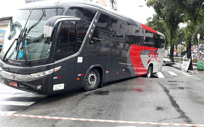 Ônibus fica preso em cratera após asfalto ceder em Santos