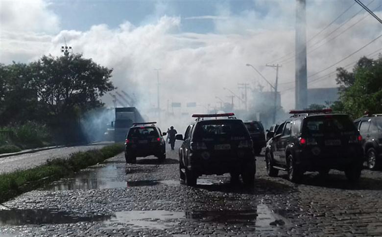 A manifestação seguia de forma pacífica, mas os cerca de 300 trabalhadores foram surpreendidos pela chegada da tropa que conseguiu dispersar o movimento